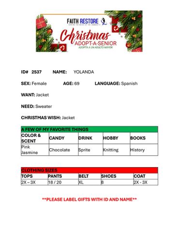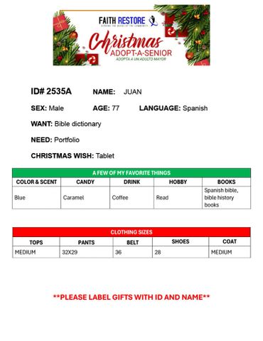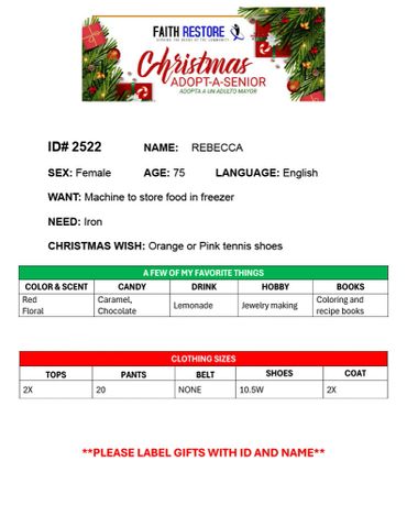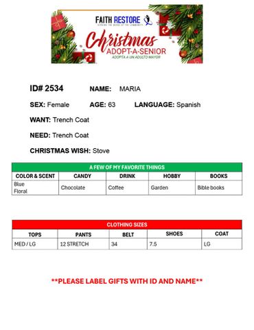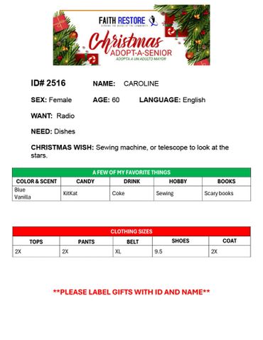 There is an optional meet and greet held in December where adopters have the opportunity to meet their senior should they choose to attend. Seniors that opt not attend the gathering will receive their gifts directly from Faith Restore Inc on another day.